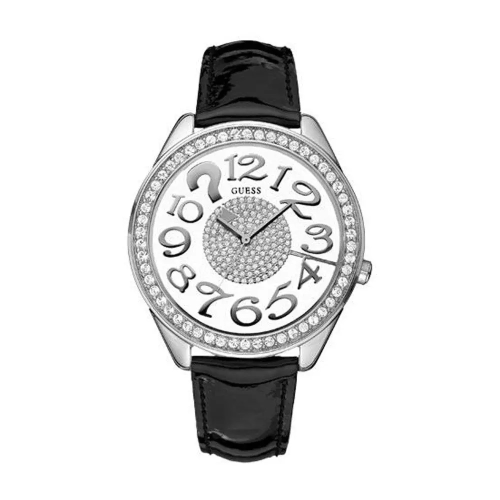 Guess Clearly Quiz W11143L1 Damenuhr – Edelstahlgehäuse Silber – Lederarmband Schwarz – Analoge Anzeige – Quarzuhrwerk