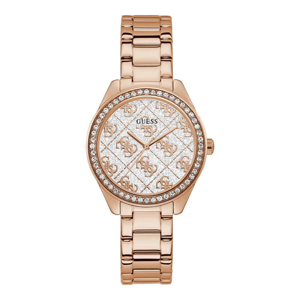 - Edelstahlgehäuse, rosegoldfarbene Beschichtung, poliert