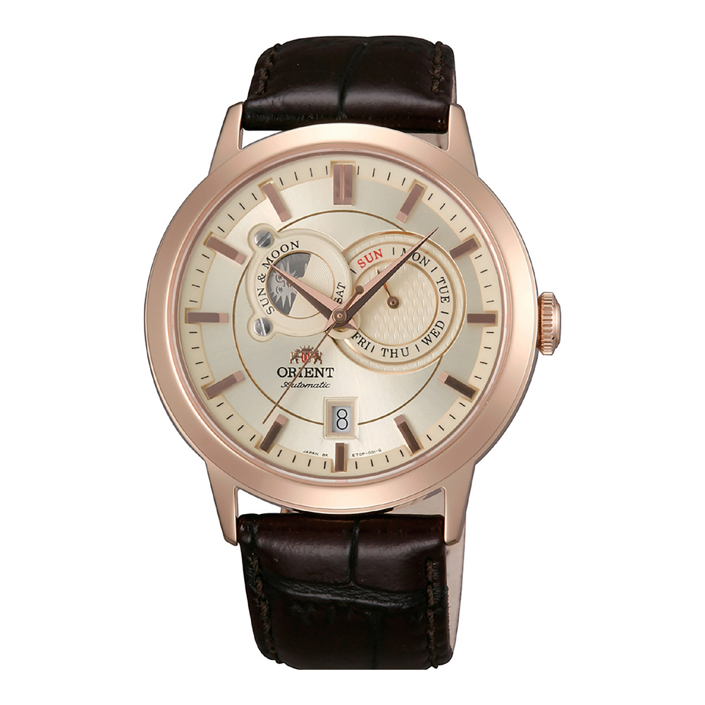 Orient Sun and Moon Automatic FET0P001W0 Herrenuhr – Edelstahlgehäuse Rosegold – Lederarmband Braun – Analoge Anzeige – Automatikuhrwerk