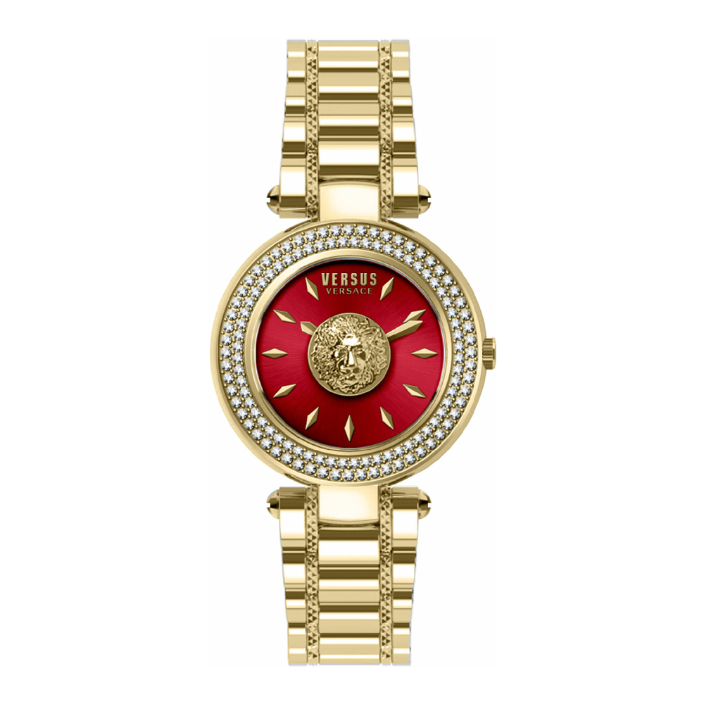 - Edelstahlgehäuse, goldfarbene Beschichtung, poliert, mit Steinen besetzt